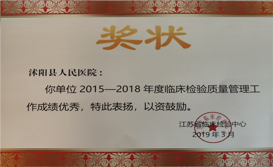 4月9日-11日,2019年江苏省医院检验科主任岗位培训班暨2015-2018年度临床检验质量管理工作总结会议在南京召开。会上,通报表彰了2015-2018年度江苏省检验质量管理工作优秀单位,我院以全省排名第12的成绩荣获“江苏省2015-2018年度临床检验质量管理工作优秀单位”称号,同时连续12年被确定为江苏省检验结果互认单位。这是继我院连续2届(8年)获得全省临床检验质量管理优良单位基础上的重大突破,也是全省唯一一家县级医院获此殊荣。全省临床检验质量管理工作优秀单位评比工作由江苏省卫健委临床检验中心组织实施,对全省400家二、三级医院进行评比,每四年一次,是全省医疗机构质量管理重要组成部分,也是全省临床实验室全面质量管理的最高奖项。省临床检验中心根据每年的考核结果和现场调查情况,从检验科管理规范、技术能力水平、质量管理工作、生物安全保障等方面对四年的成绩进行综合评比,最终评选出优秀单位20家,优良单位72家。