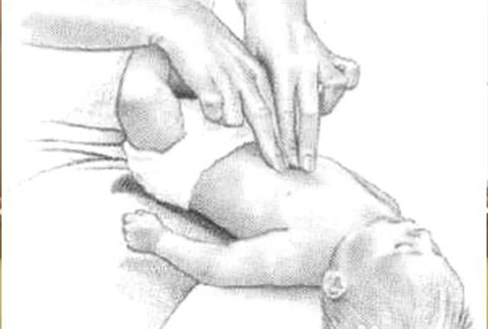 也可以采取另外一个姿势,把孩子翻过来,躺在坚硬的地面或床板上,抢救者跪下或立于其足侧,或取坐位,并使患儿骑在抢救者的大腿上,面朝前。抢救者以两手的中指或食指,放在患儿胸廓下和脐上的腹部,快速向上重击压迫,但要很轻柔。重复,直至异物排出。