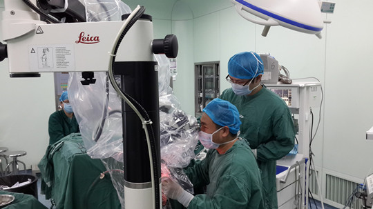 经过最快的术前准备,在小张入院的第二天就在全麻下给她施行了显微镜下颅内肿瘤切除术。手术由刘连松主任主刀,副主任医师周大志、翟晓雷协助,经过3个小时,完整切除了小张左侧大脑顶部的6×6厘米大的肿瘤。术后小张头痛呕吐症状立即得到缓解,第二天就能够吃东西并下床活动了。