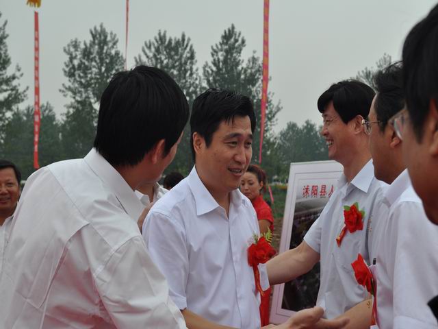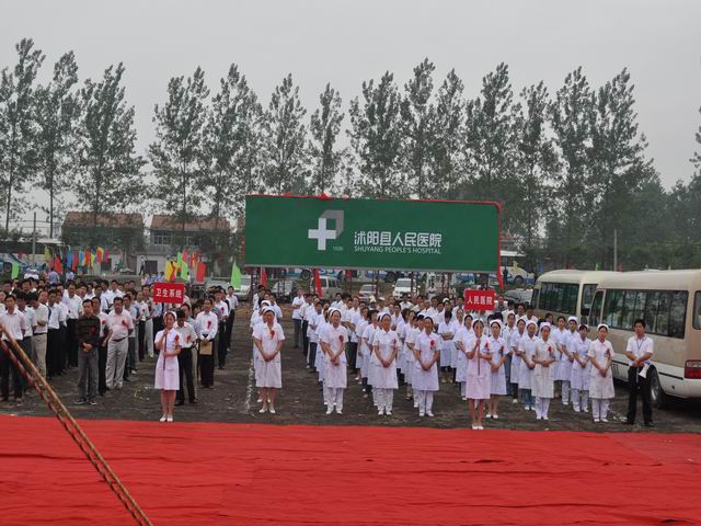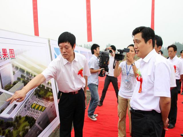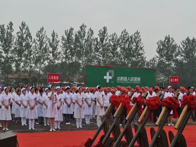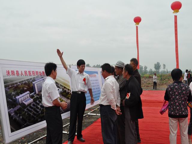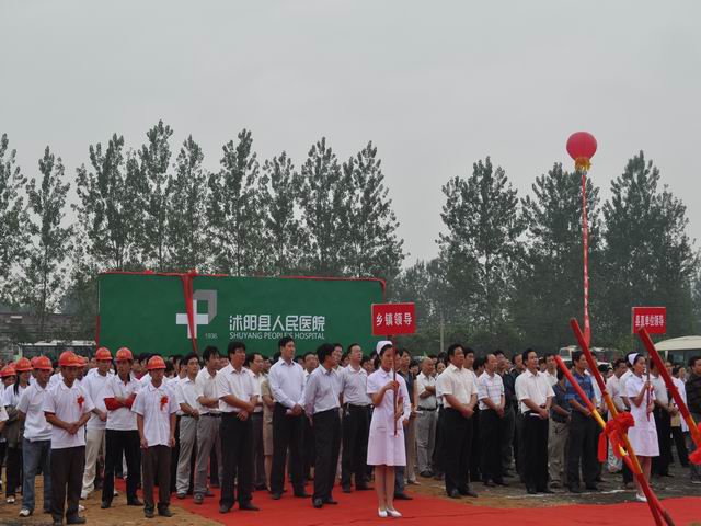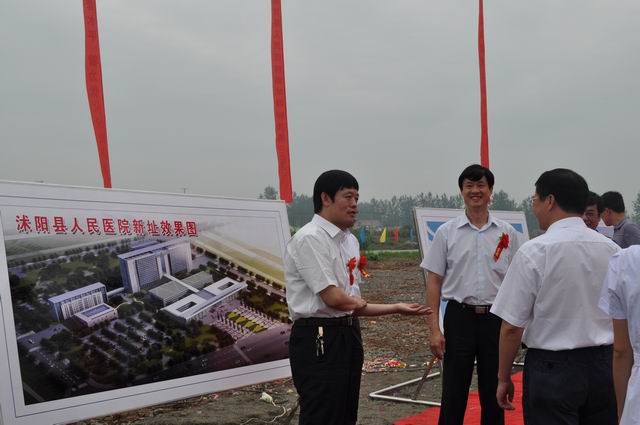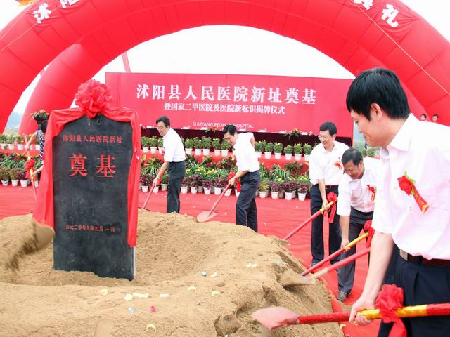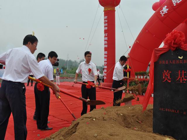 省人民医院副院长顾民、徐州医学院院长吴永平、苏州大学附属儿童医院党委书记刘高金,县委书记蒋建明、县委副书记、县长乔翠聪、县人大常委会主任王庚绪、县政协主席丁建平、县政协党组书记张欣、县委副书记陈辰扬、县委副书记、常务副县长卞建军、市卫生局医政处处长周东浩、沭阳县人民医院院长周业庭共同为新医院址奠基