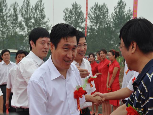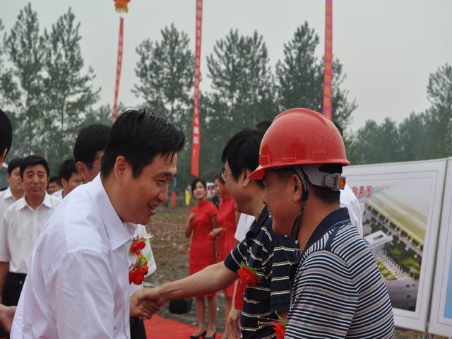 县委书记蒋建明与施工单位江苏国丰集团总经理周宏生亲切握手