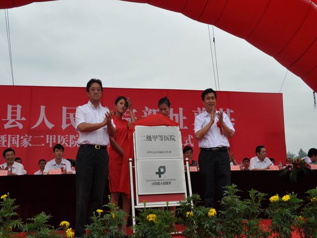 省人民医院副院长顾民、县委书记蒋建明为县人民医院新标识和二级甲等医院揭牌