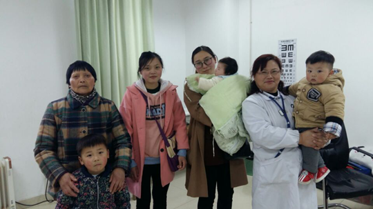 一位婆婆和两个儿媳一起带着3个孙子来体检,与杨奶奶合影留念。