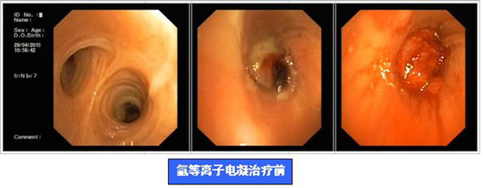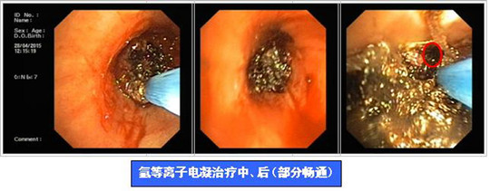 男性患者,80岁,4月底因反复咳嗽5月余,伴气喘一周,渐感胸痛、胸闷和气促等不适,来我院就诊,行胸部动态CT提示气管内肿物:右肺中间段支气管闭塞,见类圆形软组织密度影,边界不清,大小约为4.1*3.6cm,边缘见毛刺征,增强后明显不均匀强化,两肺见斑片影、磨玻璃影;支气管镜检查提示:右肺中叶支气管开口下2cm见软组织肿物、堵塞支气管腔,支气管镜体完全不能通过。入院诊断:右肺恶性肿瘤、心房颤动、脑梗塞后遗症、2型糖尿病、高血压病(极高危)和肾功能不全。经内科对症处理后,临床症状未见缓解。院内会诊和积极术前准备后,拟行纤维支气管镜下肿物活检术和氩等离子电凝切除术。