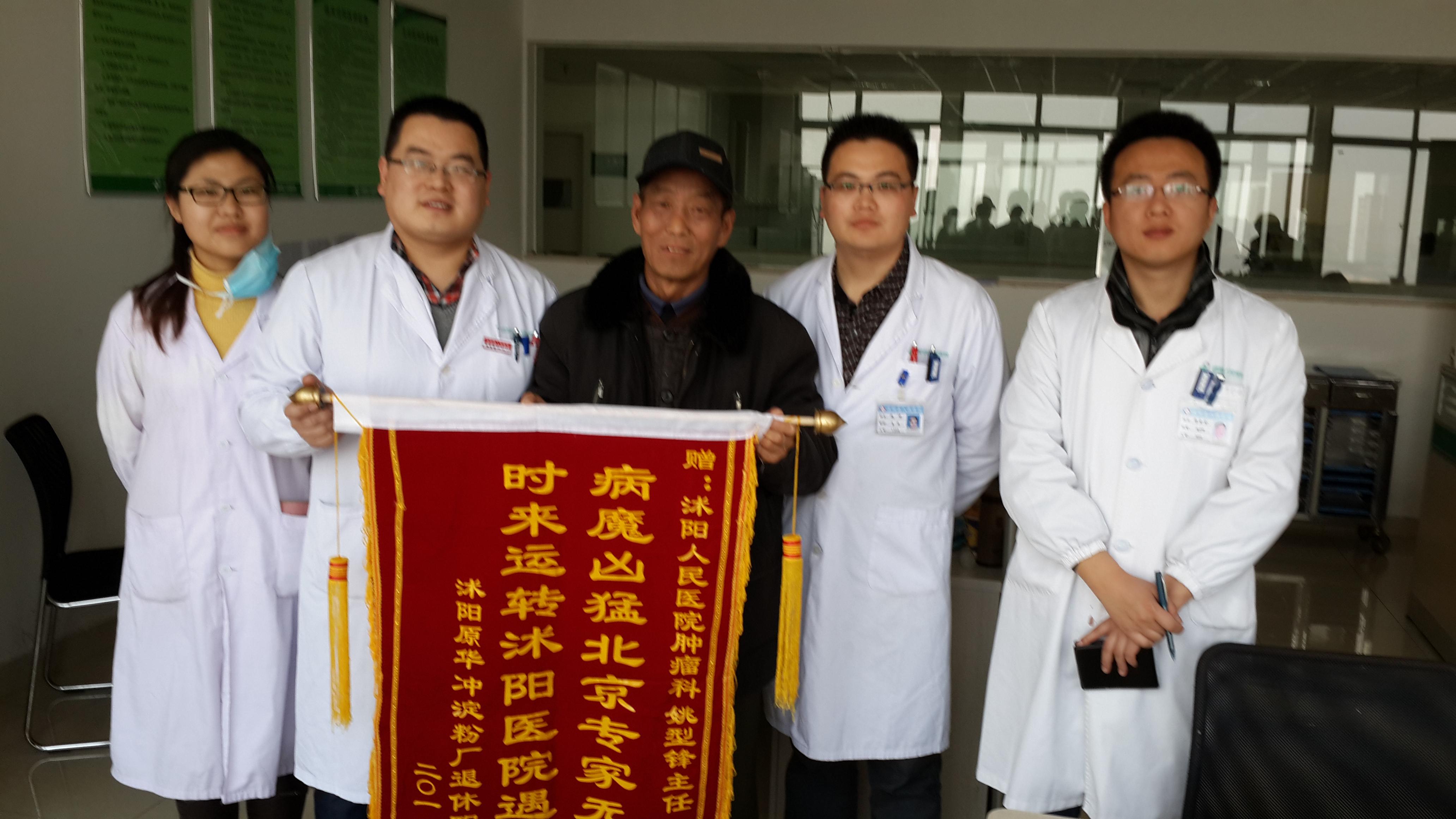 在女儿安排下,通过托关系,终于在北京某医院住下来,抽血化验、增强CT各个检查下来已经过去了一个月,肚子上的肿块仍在长大。后终于诊断为胃癌肝转移,北京医院专家估计最多还能活四个月!听到这个消息,患者整个家庭几乎陷入绝望!没办法,患者回到沭阳,抱着一点点侥幸心理到沭阳县人民医院保守治疗,肿瘤二病区姚型锋比较过患者复查的各项资料,决定于口服希罗达化疗,没想到,奇迹在第二个疗程就已经开始出现,患者腹部肿瘤逐渐消退,这下患者一下子看到了希望,坚持到第四个疗程,患者复查肝脏CT肿瘤已经基本消失。从患者诊断疾病至今,已有七个月,未出现其他脏器转移。为了感谢姚型锋主任,患者送来一面锦旗:病魔凶猛北京专家无良策,时来运转沭阳医院遇神医。患者用颤抖的手握住姚主任的手,谢谢姚主任,谢谢人民医院,给了他第二次生命!