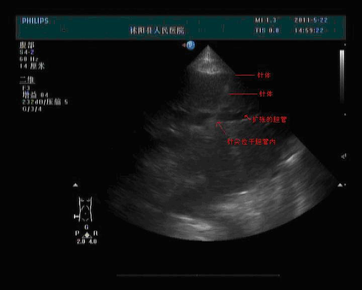 图1:超声清晰显示针体及针尖方向,针尖位于胆管内。