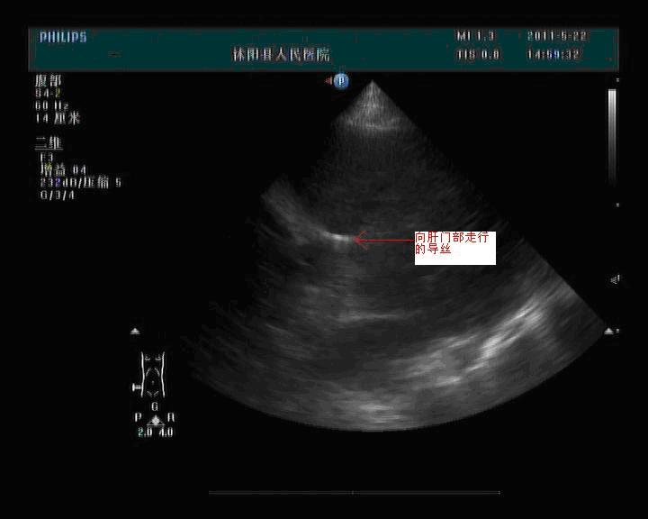 图2、超声清楚的看到导丝沿左肝内胆管向肝门部胆管走行。