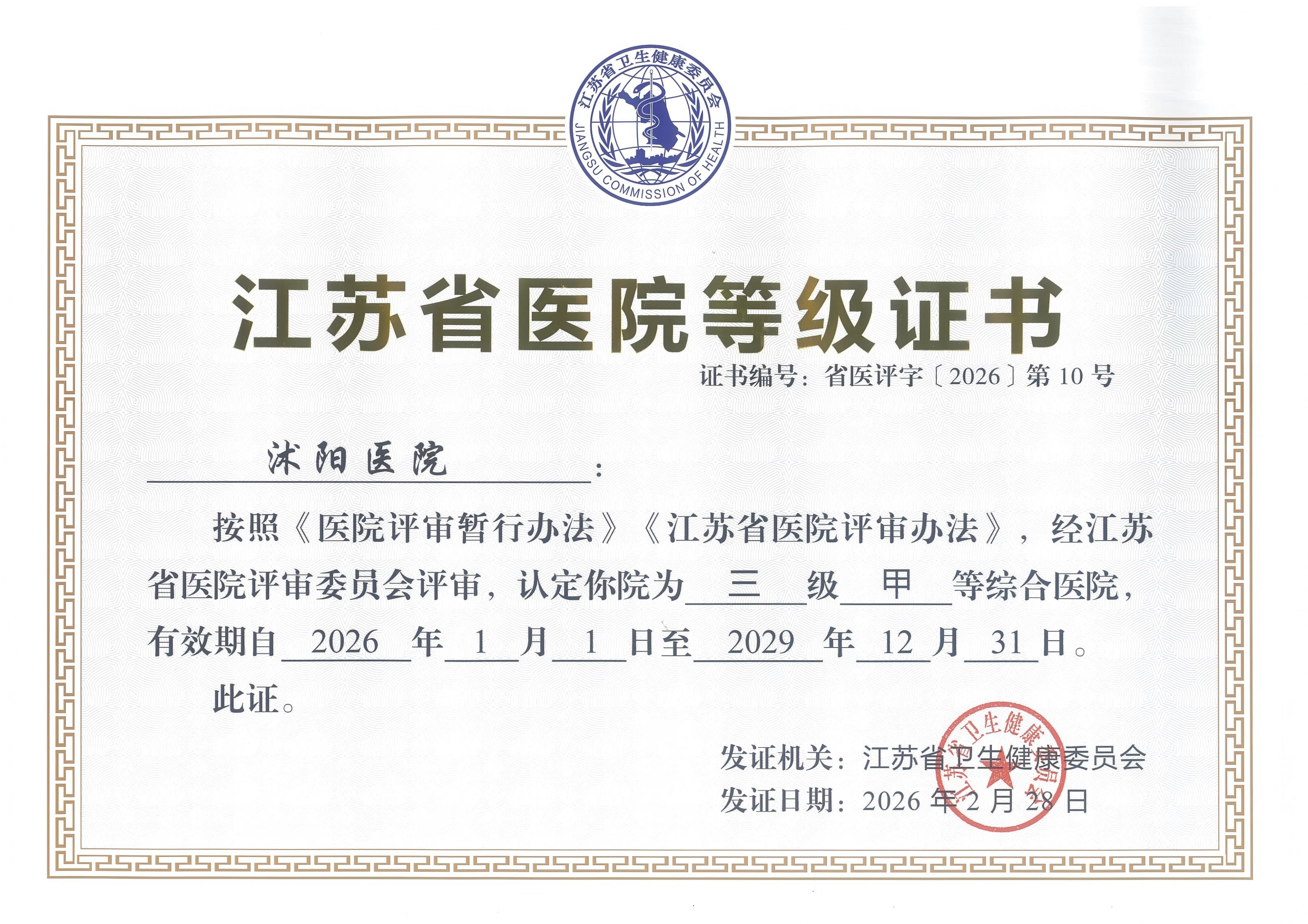 江苏省医院等级证书